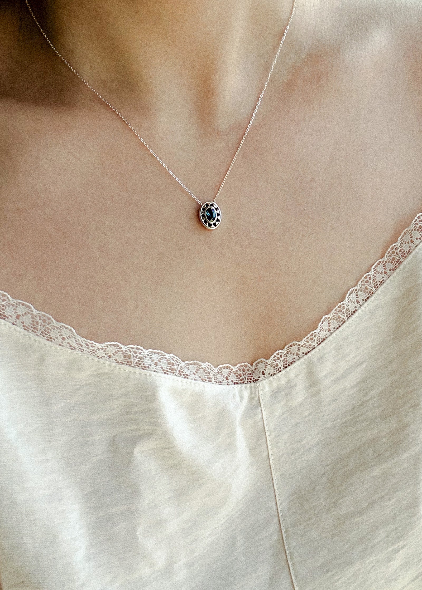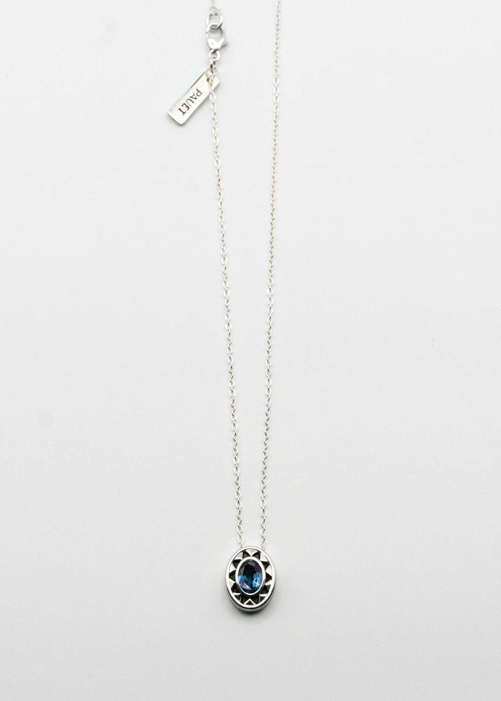 Sterling silver necklace featuring a tiny, vibrant faceted London blue topaz in a uniquely designed bezel with blackened silver detail—a subtle accent for everyday wear.
