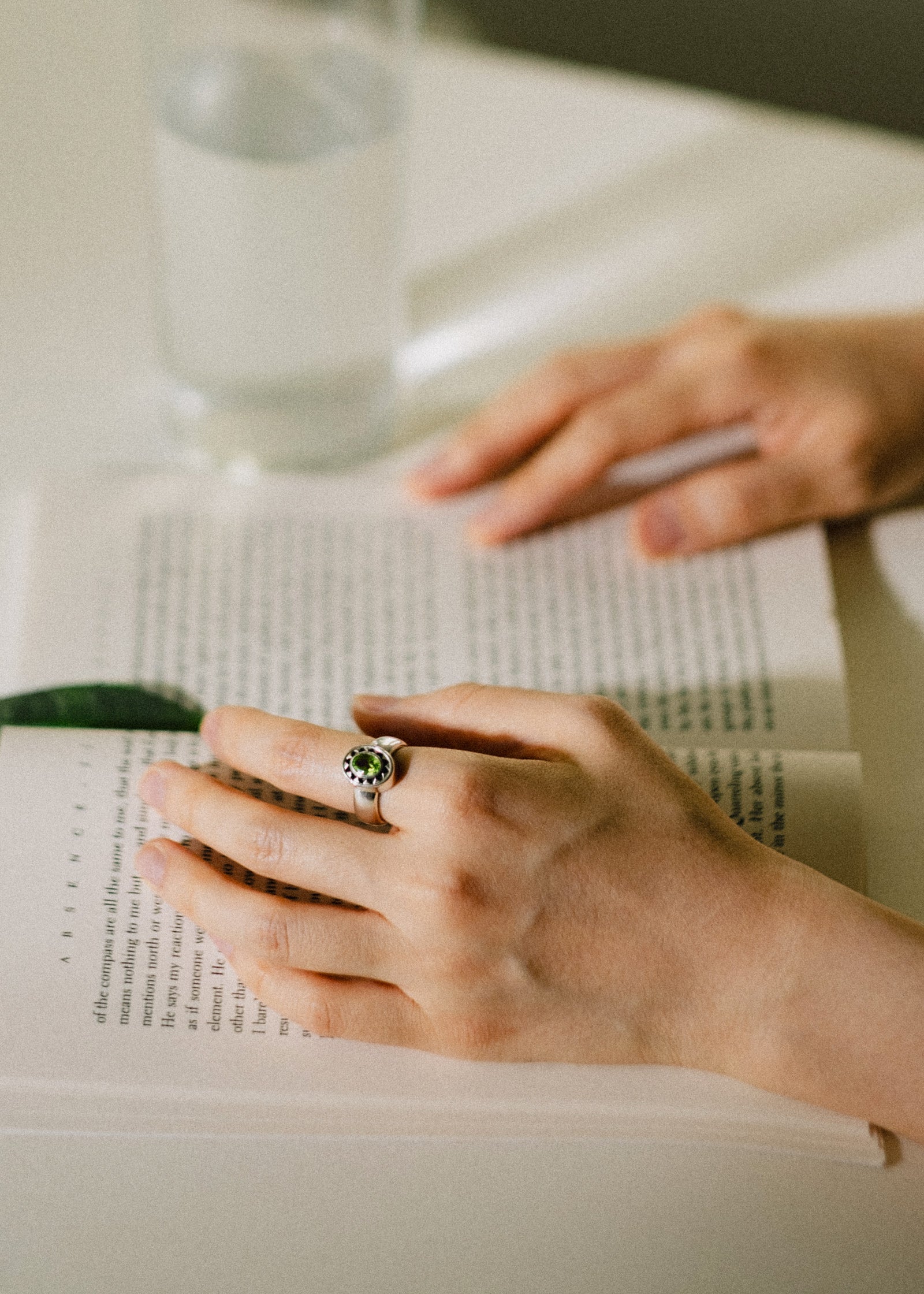 Sterling silver ring featuring a vibrant faceted green peridot in a uniquely designed bezel with blackened silver detail.