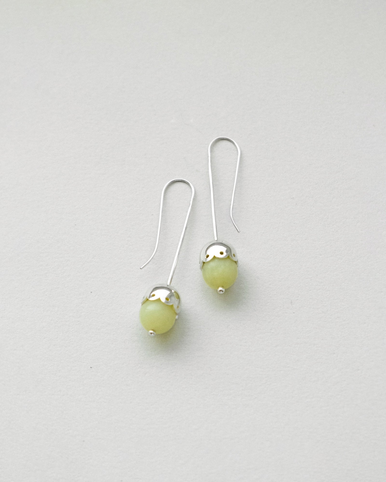 Long drop earrings featuring light yellow-green lemon jade, set with a scalloped sterling silver cap and suspended from an elongated silver ear wire. The distinctive silhouette brings a refined, elegant vibe—a statement piece for both everyday wear and special occasions.