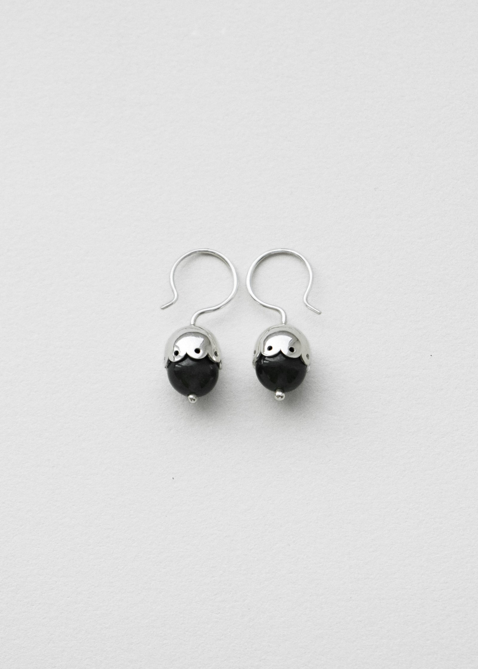 Drop earrings featuring black onyx, finished with a sterling silver cap with scalloped detail and a uniquely shaped silver ear wire for a distinct silhouette. Slightly bolder than our 8mm style, yet still an elegant and effortless accent for everyday wear.
