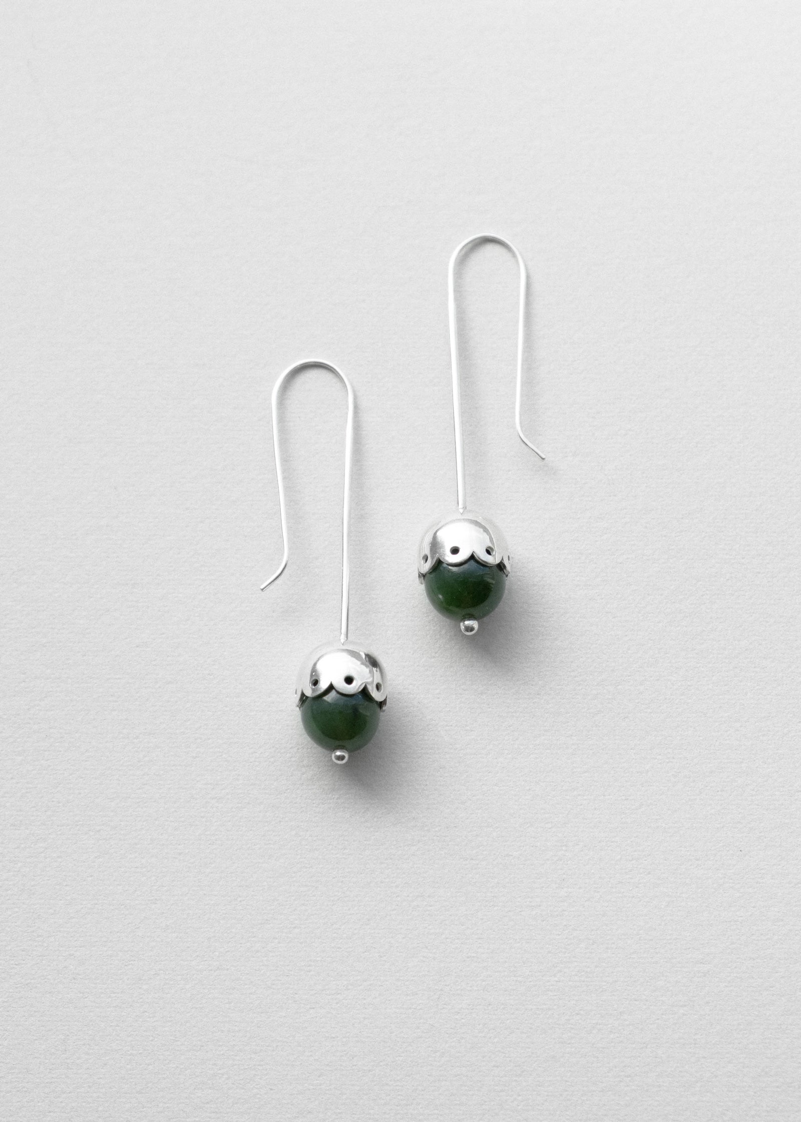 Long drop earrings featuring light deep green jade, set with a scalloped sterling silver cap and suspended from an elongated silver ear wire. The distinctive silhouette brings a refined, elegant vibe—a statement piece for both everyday wear and special occasions.