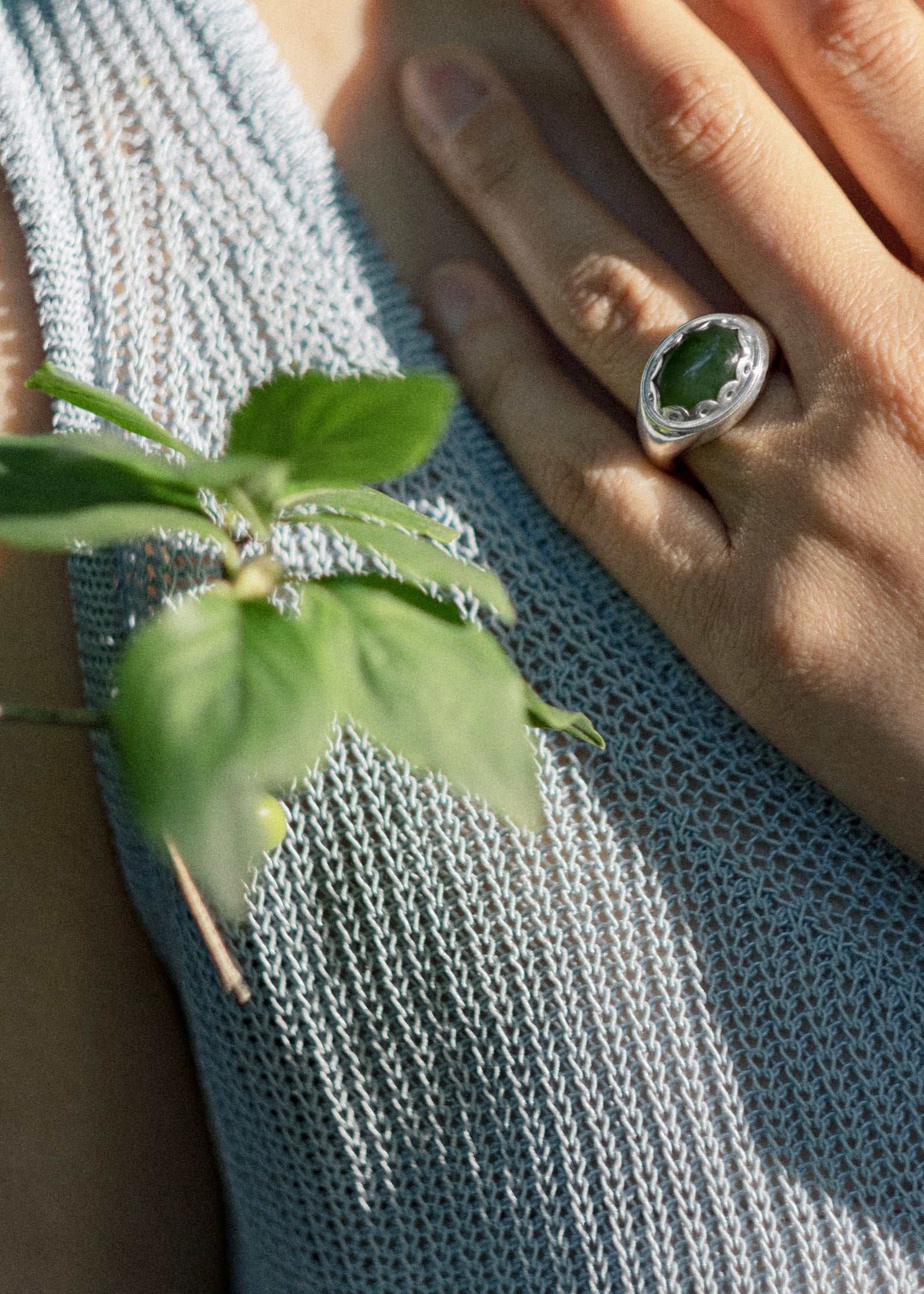 Bold and rounded, this sterling silver ring features an oval deep green jade centerpiece framed by a scalloped bezel. Softly sculpted curves and a comfortable weight give it a substantial, pleasing presence—a classic yet distinctive look.